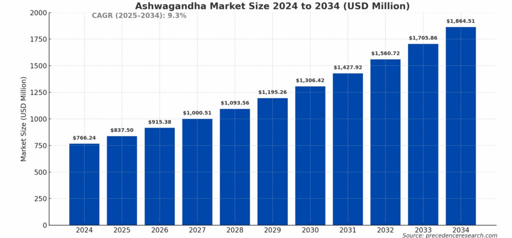 According to Precedenceresearch.com, the global market for Ashwagandha (Withania Somnifera) is projected to grow from USD 837.5 million in 2025 to approximately USD 1.86 billion by 2034, with a CAGR of 9.3%. This expansion reflects increasing demand across commercial health product segments—from dietary supplements and wellness beverages to cosmeceuticals and pharmaceutical formulations.